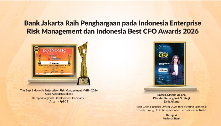 JAKARTA | DutaIndonesia.com – Bank Jakarta kembali memperoleh apresiasi atas komitmennya dalam memperkuat tata kelola dan kinerja berkelanjutan dengan meraih dua penghargaan pada hari yang sama, yakni Indonesia Enterprise Risk Management 2026 yang diselenggarakan oleh Economic Review serta Indonesia Best CFO Awards 2026 yang diselenggarakan oleh Warta Ekonomi, pada Jumat (27/02).