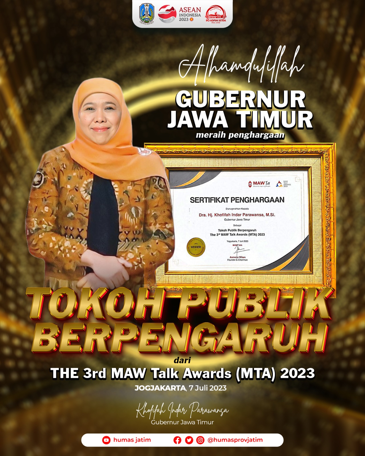 SURABAYA| DutaIndonesia.com – Gubernur Jawa Timur Khofifah Indar Parawansa meraih penghargaan sebagai Tokoh Publik Berpengaruh dalam The 3rd MAW Talk Awards 2023 di Crystal Lotus Hotel Yogyakarta, Kamis (7/7/2023).