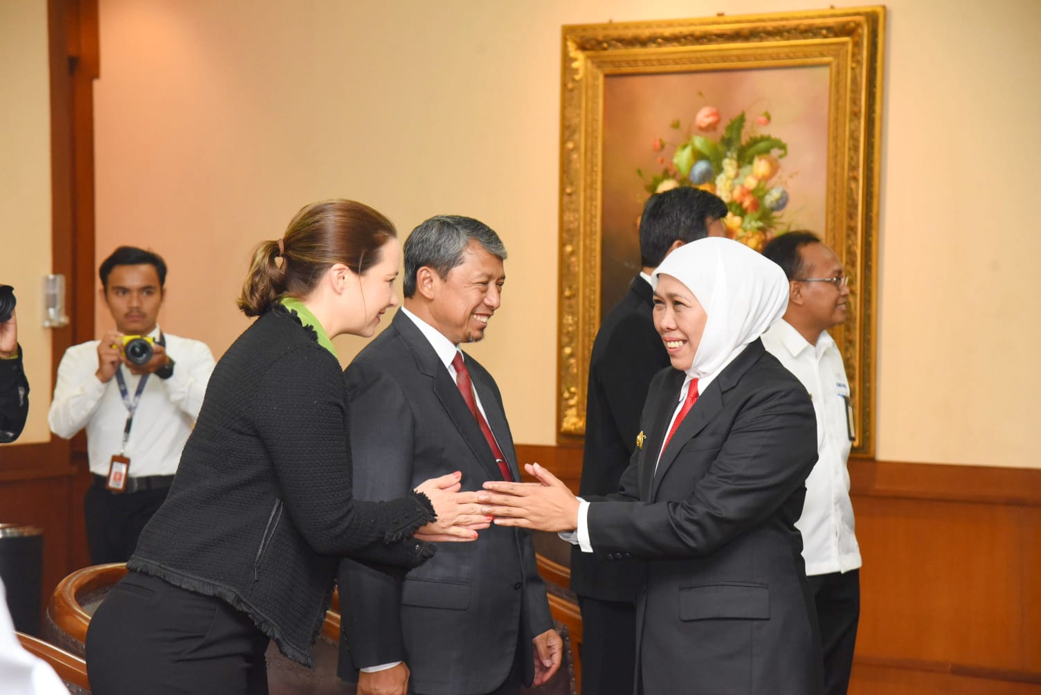 Turut hadir Anggota Komisi XI DPR RI Indah Kurniawati, Kapolda Jatim Irjen Pol. Toni Harmanto, Kepala Pengadilan Tinggi Jatim Herri Swantoro, jajaran Forkopimda Jatim, Konsul Jenderal Jepang Takeyama Kenichi, Konsul Jenderal Australia di Surabaya Fiona Hoggart, Honorary Consulate of The Kingdom of Morocco Djamal Ghozi Basmeleh, Ketua Dekranasda Provinsi Jatim Arumi Bachsin Emil Dardak, jajaran Kepala Instansi Vertikal di Jatim, beberapa Bupati/Walikota di Jatim, serta para Kepala OPD Pemprov Jatim. (gas)