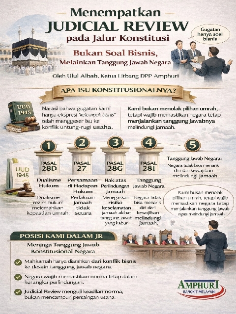 Mereka menilai, Pasal 86 ayat (1) huruf b UU Haji dan Umrah membuka ruang penyelenggaraan umrah mandiri tanpa menempatkannya dalam rezim perizinan dan pengawasan yang setara dengan penyelenggara perjalanan ibadah umrah (PPIU). Berikut grafis untuk memahami betapa pentingnya gugatan ke MK terkait istilah umrah mandiri dalam UU Haji dan Umrah: