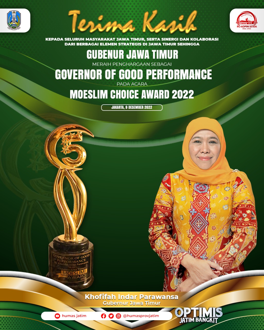“Terima kasih atas apresiasi yang diberikan, bahwa kami menjadi salah satu kepala daerah yang menerima Penghargaan Moeslim Choice Award 2022 sebagai Governor of Good Performance. Penghargaan ini saya dedikasikan untuk seluruh masyarakat Jawa Timur yang telah bergotong royong bersama sama membangun Jawa Timur,” tegas Khofifah.
