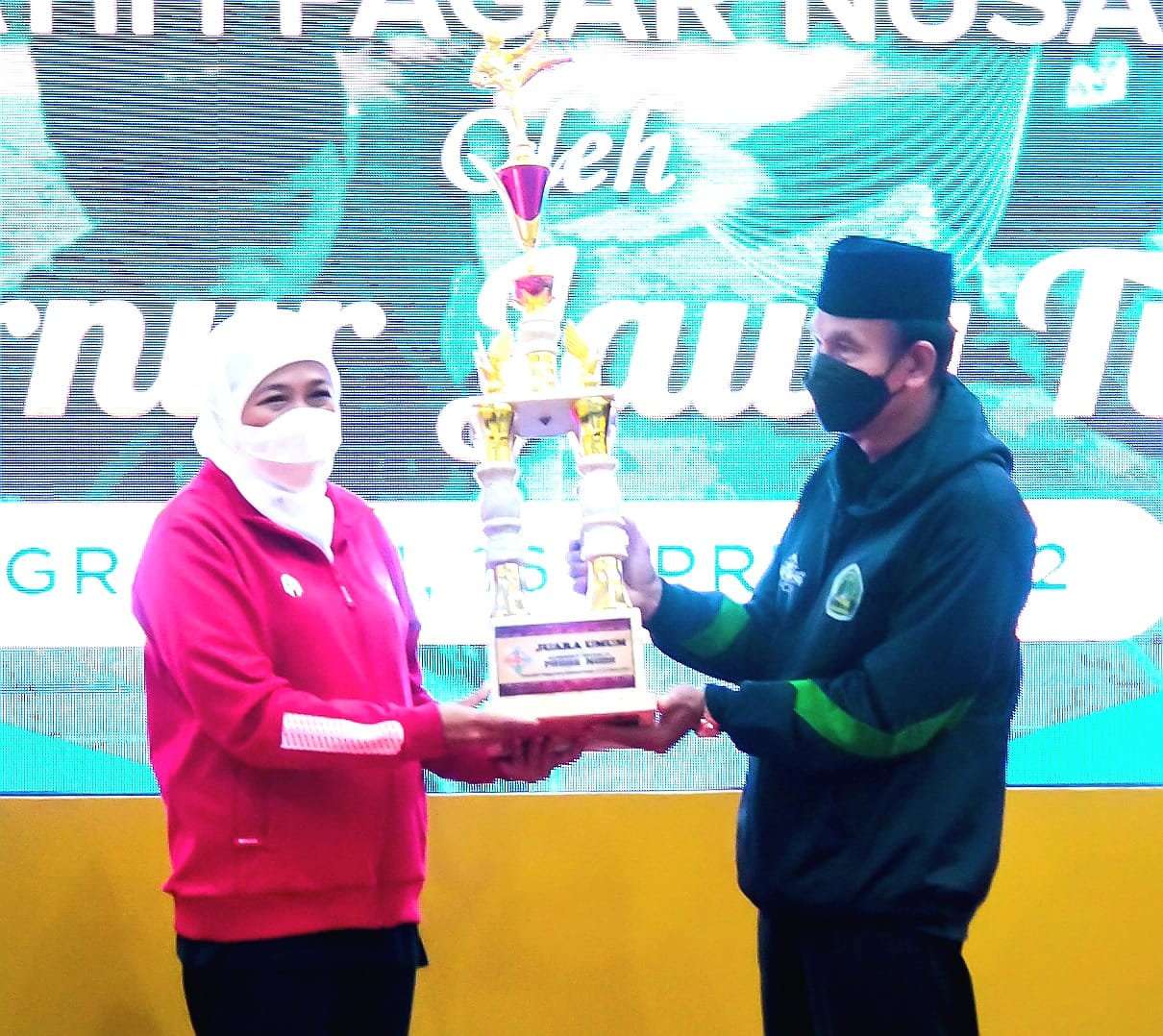 Juga dilakukan penyerahan piala juara umum dari Ketua PW Pagar Nusa Jawa Timur kepada Gubernur Jawa Timur didampingi Ka. Dispora Prov. Jatim.