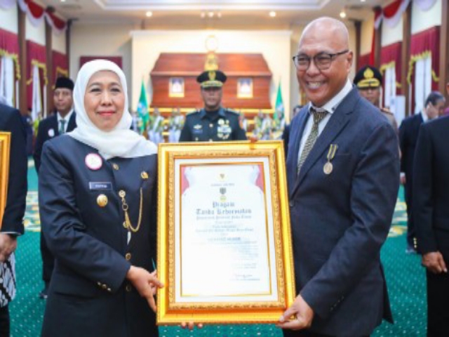 SURABAYA | DutaIndonesia.com – Ketua Umum Persatuan Wartawan Indonesia (PWI) Pusat, Akhmad Munir atau biasa dipanggil Cak Munir, menerima Lencana Kehormatan Provinsi Jawa Timur Jer Basuki Mawa Beya dari Gubernur Jawa Timur Khofifah Indar Parawansa, pada puncak peringatan Hari Jadi ke-80 Provinsi Jawa Timur, yang digelar di Gedung Negara Grahadi, Surabaya, Minggu (12/10/2025).