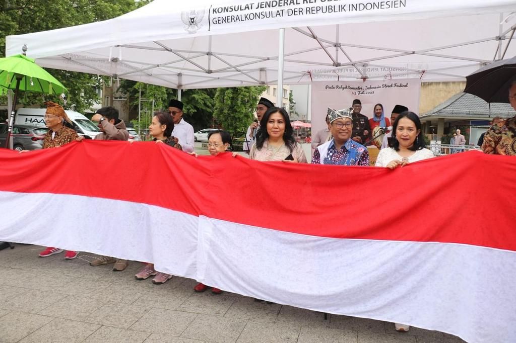Kirab bendera merah putih sepanjang 40 meter menjadi pembuka Pasar Rakyat yang kali ini sekaligus sebagai acara perpisahan dengan Konjen RI Frankfurt dan Ibu Lilies Ekawaty Somantri yang akan mengakhiri tugas pada 31 Juli 2023. Konjen RI Frankfurt, Acep Somantri dalam sambutan pembuka menyampaikan apresiasi terhadap seluruh organisasi masyarakat di wilayah kerja yang telah mendukung seluruh program yang dicanangkan selama penugasan sehingga kegiatan berjalan dengan lancar dan melampaui target capaian.