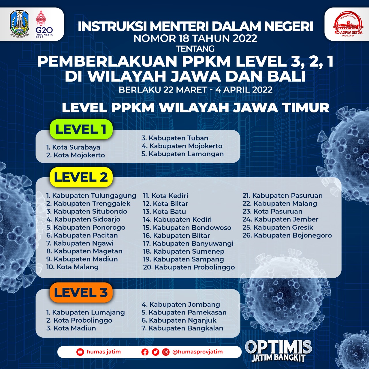 Sedangkan yang statusnya level 2 di Jatim yaitu Kabupaten Tulungagung, Kabupaten Trenggalek, Kabupaten Situbondo, Kabupaten Sidoarjo, Kabupaten Ponorogo, Kabupaten Pacitan, Kabupaten Ngawi, Kabupaten Magetan, Kabupaten Madiun, Kota Malang, Kota Kediri, Kota Blitar, Kota Batu, Kabupaten Kediri, Kabupaten Bondowoso, Kabupaten Blitar, Banyuwangi, Kabupaten Sumenep, Kabupaten Sampang, Kabupaten Probolinggo, Kabupaten Pasuruan, Kab Pasuruan, Kabupaten Jember, Kabupaten Gresik, Kabupaten Bojonegoro.