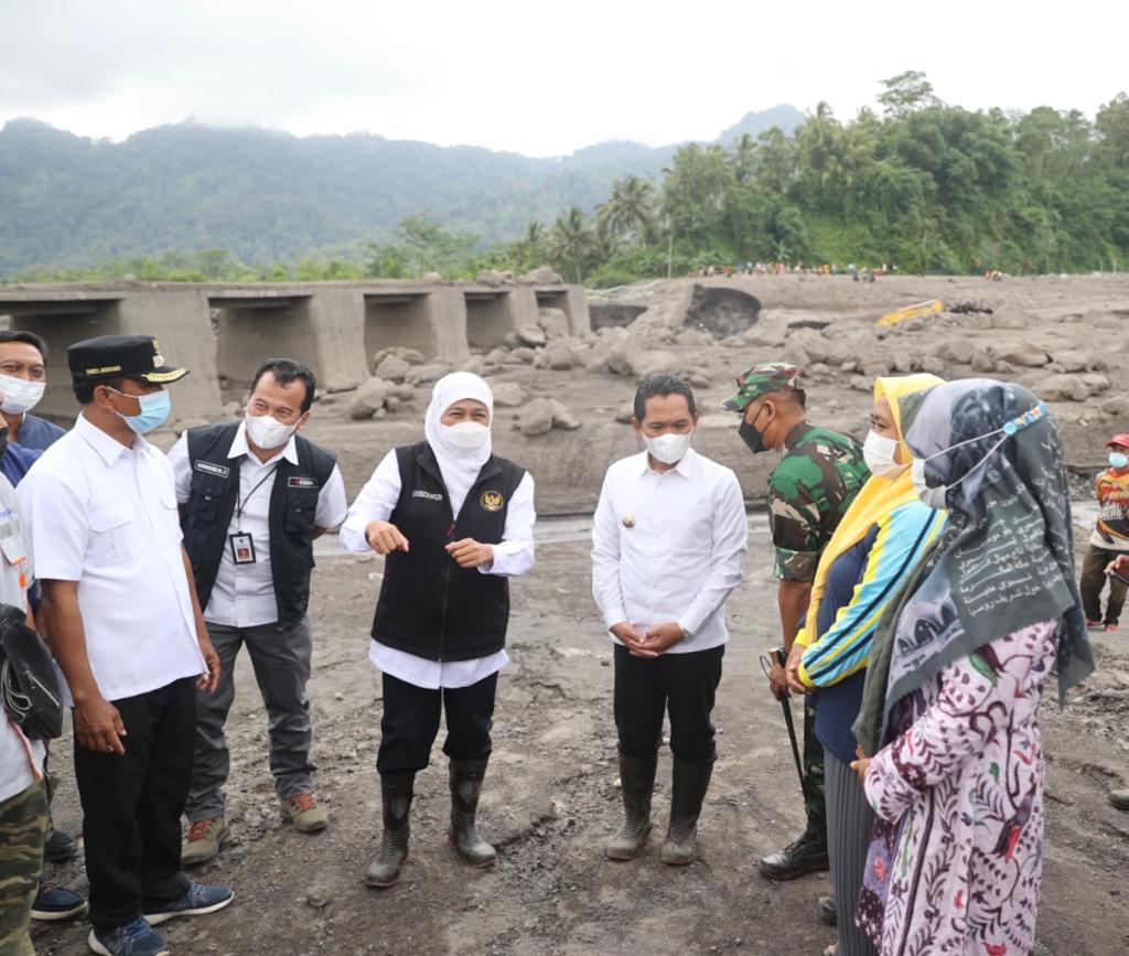 LUMAJANG|DutaIndonesia.com – Gubernur Jawa Timur Khofifah Indar Parawansa meninjau dampak banjir lahar dingin di daerah aliran sungai (DAS) yang berhulu di puncak Gunung Semeru yang mengakibatkan jembatan DAM di Dusun Sumberlangsep, Desa Jugosari, Kec. Candipuro, Kabupaten Lumajang putus, Rabu (5/1/2022).