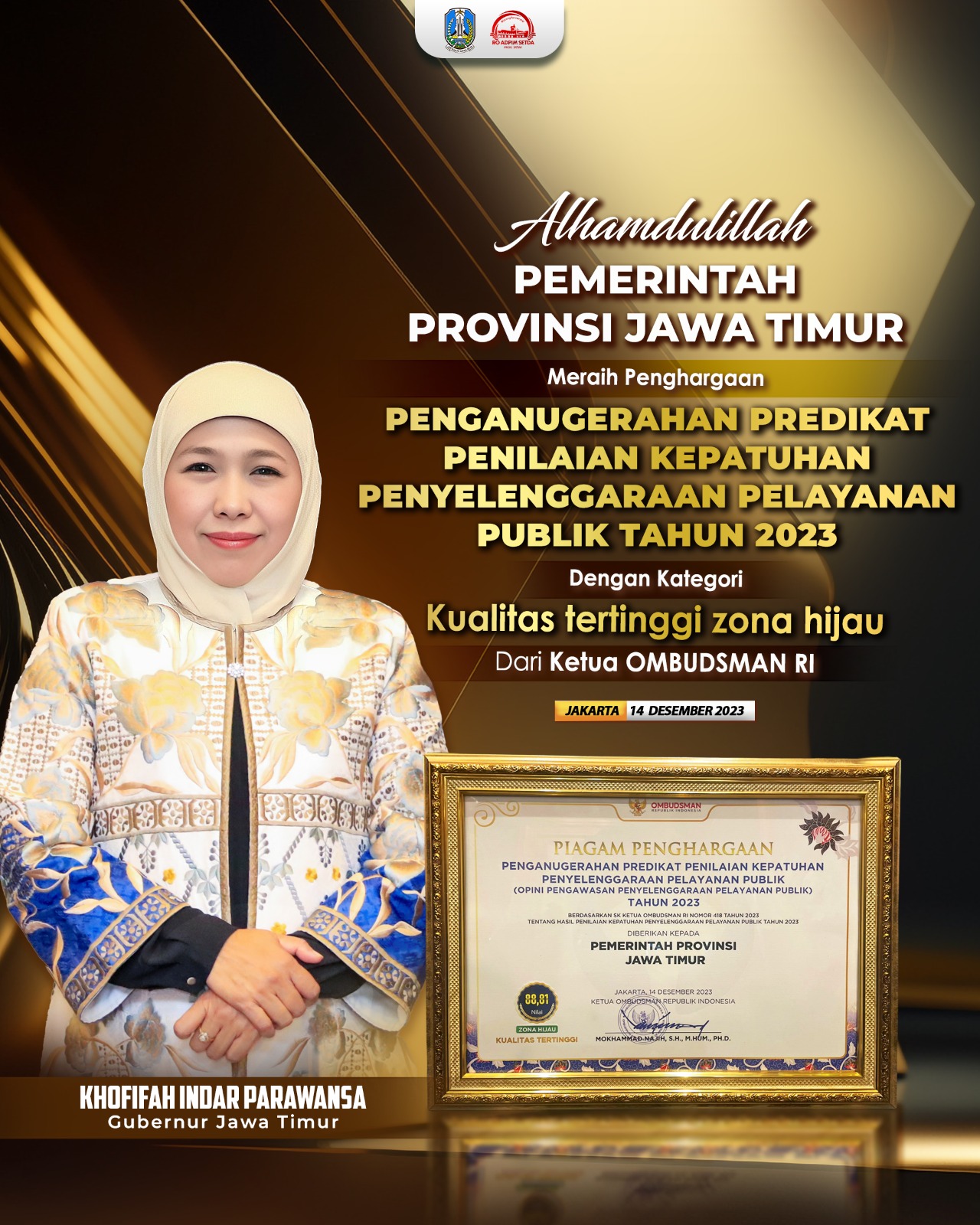 Pemprov Jatim Raih Penghargaan Ombudsman RI, Gubernur Khofifah: Alhamdulillah, Hasil Nilai Kepatuhan Yanblik Jatim Capai 88,81 Predikat Kualitas Tertinggi