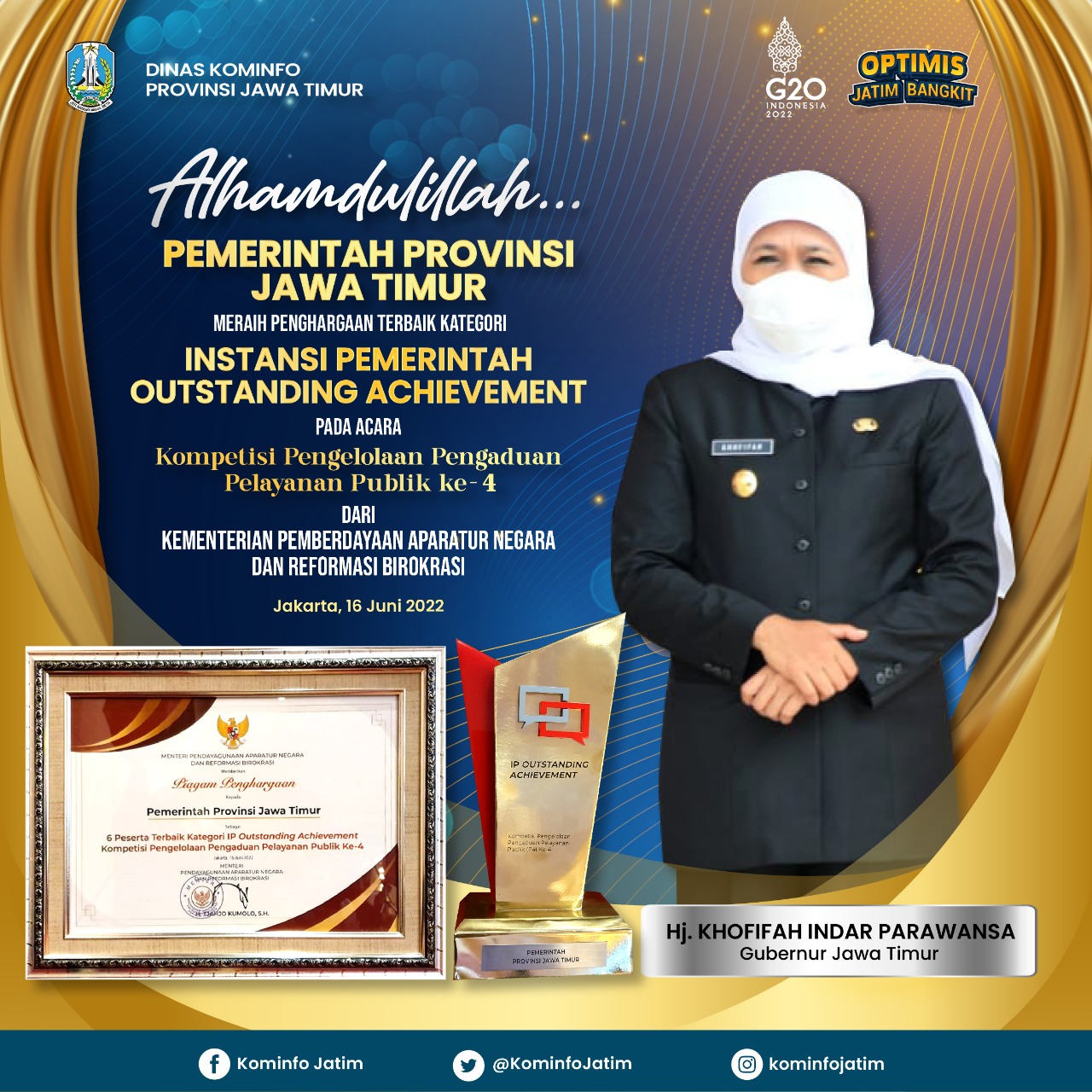 “Alhamdulillah, Penghargaan Outstanding Achievement atau Prestasi Luar Biasa ini diraih Pemprov Jawa Timur setelah sebelumnya tiga kali berturut-turut meraih penghargaan sebagai kategori terbaik. Penilaian dari Kemenpan RB ini berdasarkan SP4N Lapor. Ini adalah layanan penyampaian semua aspirasi dan pengaduan masyarakat yang terintegrasi secara nasional,” kata Gubernur Khofifah di kantor Gubernur, Senin (20/6/2022).