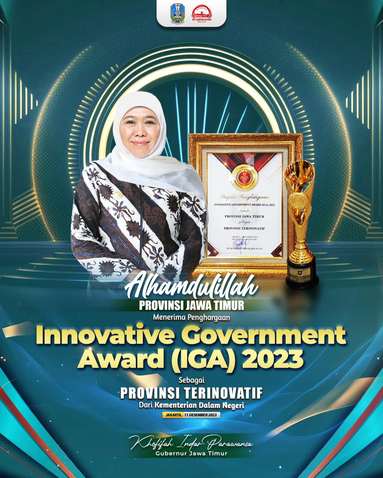 Piala dan Piagam penghargaan Provinsi Terinovatif ini diserahkan langsung oleh Menteri Dalam Negeri Muhammad Tito Karnavian kepada Gubernur Khofifah yang diwakili oleh Sekretaris Daerah Provinsi Adhy Karyono pada acara Penganugerahan Innovative Government Award 2023 di Gedung Sasana Bakti Praja, Kemendagri, Jakarta, Selasa (12/12/2023).