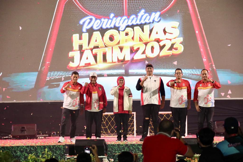 Ditandai dengan kick off berupa pemukulan bola hocky oleh Menteri Pemuda dan Olahraga Republik Indonesia (Menpora RI), Ario Bimo Nandito Ariotedjo, Gubernur Jawa Timur Khofifah Indar Parawansa, Wali Kota Kediri, Ketua KONI Jatim, Rektor Unesa, dan Kadispora Jatim, peringatan Haornas Jatim 2023 bertabur sport show, serta pemberian penghargaan untuk insan olahraga berprestasi Jawa Timur.