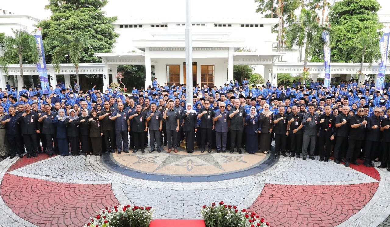 SURABAYA| DutaIndonesia.com – Jelang Hari Raya Idul Fitri 1444 H, Gubernur Jawa Timur Khofifah Indar Parawansa memimpin apel pagi bersama Aparatur Sipil Negara (ASN) dan jajaran Kepala OPD di lingkungan Pemprov Jatim di halaman Kantor Gubernur Jatim, Jalan Pahlawan 110 Surabaya, Senin (17/4/2023) pagi.