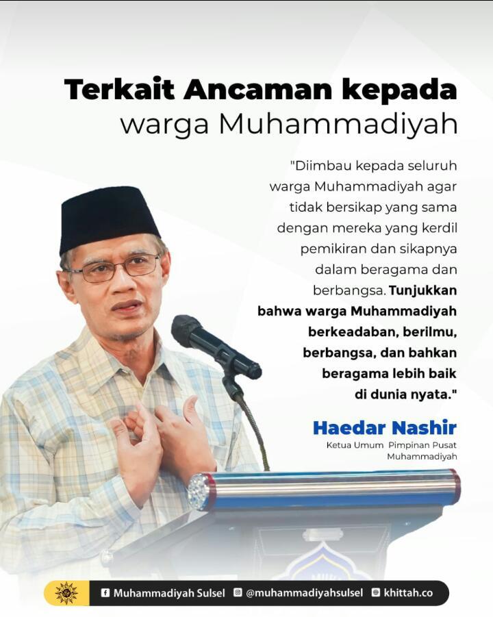 “Kini perangai serupa tertuju ke Muhammadiyah oleh orang-orang yang boleh jadi berilmu. Mungkin karena merasa benar sendiri atau memang bersikap kerdil yang tentu tak sejalan dengan khazanah dunia ilmu dan akhlak Islam,” katanya.