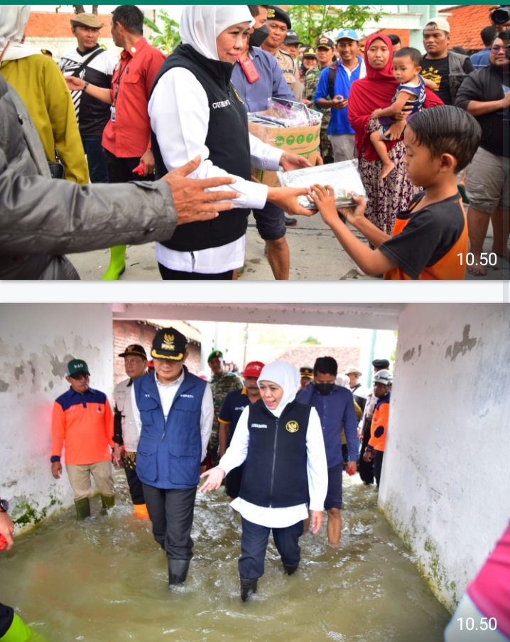 Bersama dengan Bupati Lamongan Yuhronur Efendi dan Wakil Bupati Lamongan KH Abdul Rouf, Gubernur Khofifah mengecek langsung kondisi warga di Dusun Pujut, Desa Sidomulyo, Kecamatan Deket dilanjutkan menuju pintu air Kuro.
